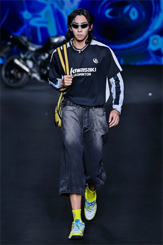 从全球首支碳素球拍的研制,到如今构建的运动科技生态,Kawasaki川崎始终以创新基因推动着行业变革,用挑战和突破精神不断探索运动边界。此次启幕的【川崎霓生】未来主义发布大秀,以“运动×科技×潮流”的先锋叙事,打破传统运动边界,是Kawasaki川崎在“未来主义美学”的一次破圈表达。发布秀以机车狂想、网羽运动、Y3K及潮流艺术家联名四大风格篇章展开,充满未来感与科技感的声光电环绕,模特穿梭其间,虚实场景深度耦合,呈现一场融合运动科技与潮流艺术的视觉盛宴。