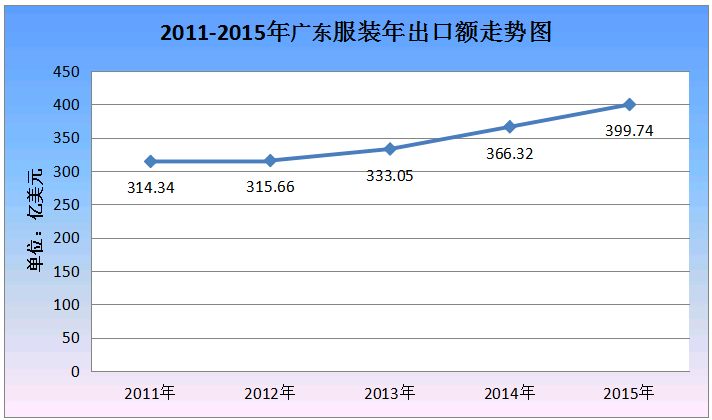 2、出口情况:滞涨期后,增速加快。“十二五”期间,广东服装出口总额一直位居全国首位,从2011年的314.34亿美元,增长到2015年的399.74亿美元,累计增长27.17%。从走势图来看,2011-2012年持平、滞涨,2013年略有增长,2014年下半年开始逐步恢复增长,2015年增速加快。2015年,广东省出口服装及衣着附件占全国22.72%,同比增长9.09%,同期全国,江苏、浙江、福建等服装大省出口均为负增长,广东在全国整体负增长(-6.35%)的情况下实现了逆势增长。过去五年,服装出口一直占广东纺织品服装外贸出口总额的3/4左右。